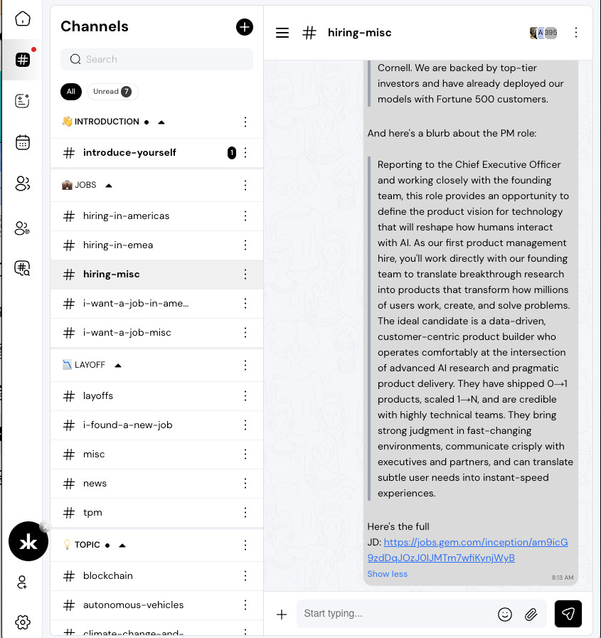 This Palo Alto PM role comes recommended by Jonathan Rosenberg, be sure to consider applying for it via email. Inception is a seed-stage AI startup developing a new type of ultra-fast and efficient LLM. Our team brings experience from Google DeepMind, Meta AI, Microsoft AI, and OpenAI and is led by founders from Stanford, UCLA, and Cornell. Reporting to the CEO and working closely with the founding team, this role provides an opportunity to define the product vision for technology that will reshape how humans interact with AI. As our first PM hire, you’ll work directly with our founding team to translate breakthrough research into products that transform how millions of users work, create, and solve problems.