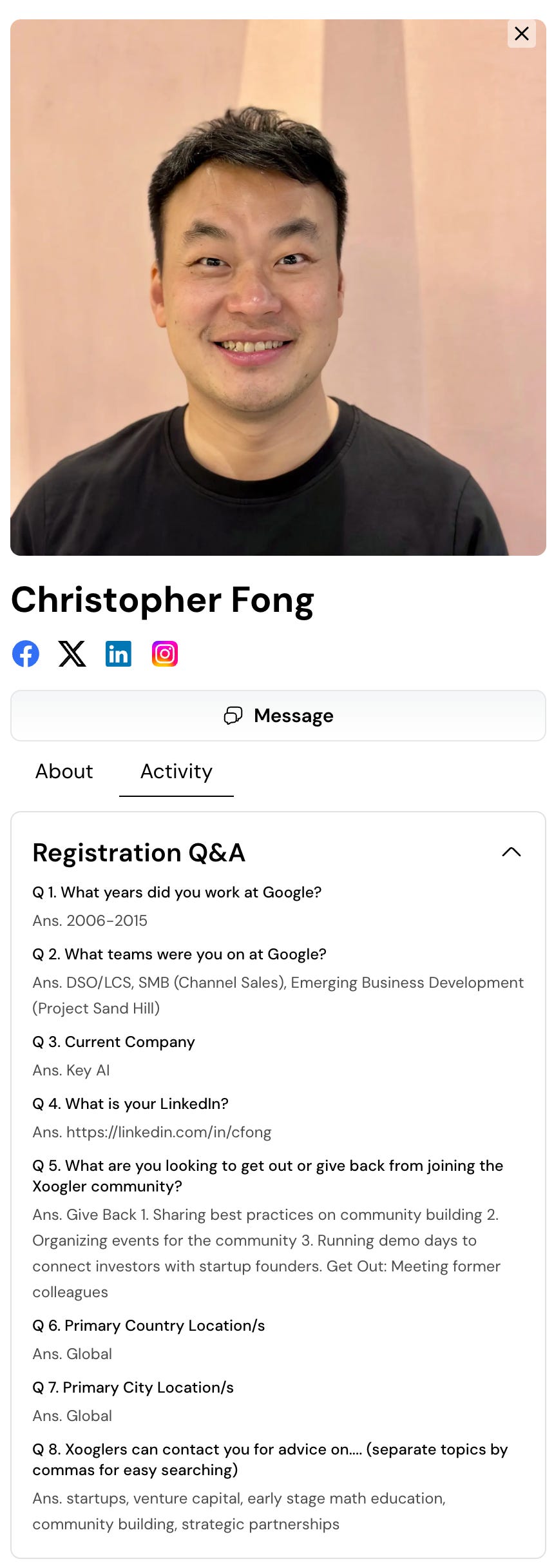 🔎 Did you know you can search for Xoogler members and message them directly to connect and chat with Xooglers in over 100+ channels across various topics? Join Nate Dumas and I for our next Americas/APAC onboarding session Tuesday October 14 or on Wednesday October 15 EMEA/APAC to learn how you can make the most out of your experience in the community! Below is a sample of the details you can see on the membership directory once you sign onto the platform.